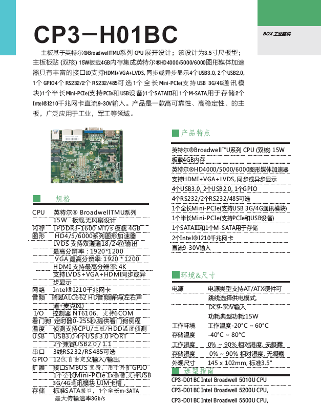 主板基于英特爾?BroadwellTMU系列 CPU 展開設(shè)計;該設(shè)計為3.5寸尺板型;主板板貼 (雙核) 15W板載4GB內(nèi)存集成英特爾