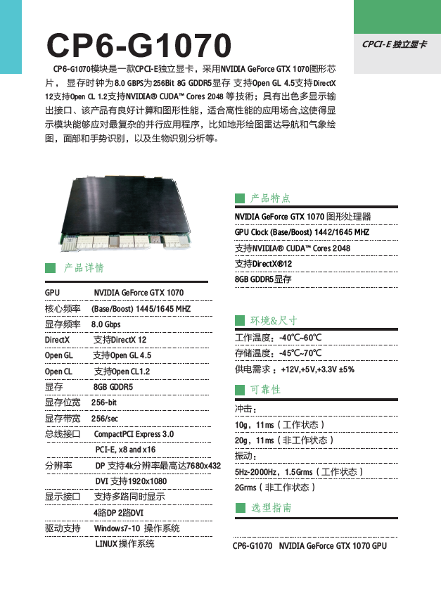 CP6-G1070模塊是一款CPCI-E獨立顯卡,采用NVIDIA GeForce GTX 1070圖形芯片, 顯存時鐘為8.0 GBPS為256Bit