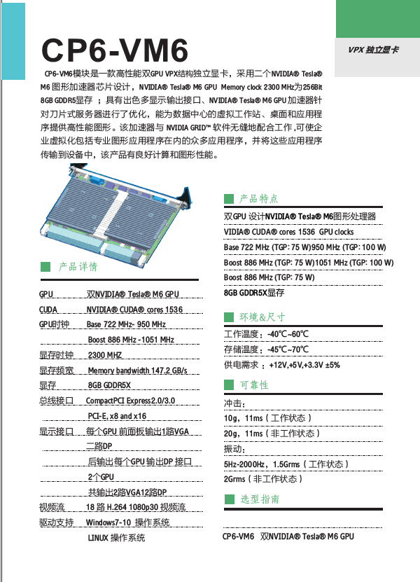 CP6-VM6模塊是一款高性能雙GPU VPX結(jié)構獨立顯卡,采用二個NVIDIA? Tesla? M6 圖形加速器芯片設計,NVIDIA?