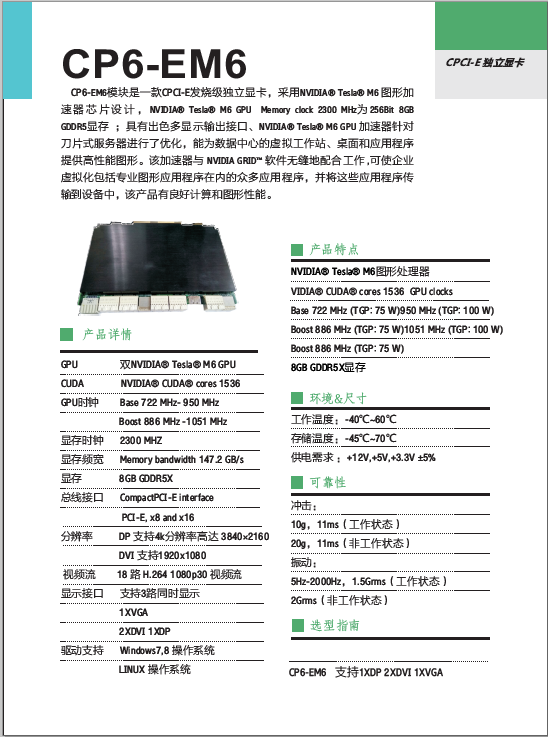 CP6-EM6模塊是一款CPCI-E發(fā)燒級(jí)獨(dú)立顯卡,采用NVIDIA? Tesla? M6 圖形加