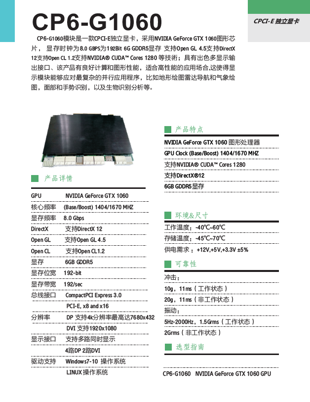 CP6-G1060模塊是一款CPCI-E獨(dú)立顯卡,采用NVIDIA GeForce GTX 1060圖形芯片, 顯存時(shí)鐘為8.0 GBPS為192Bit 6G GDDR5顯存