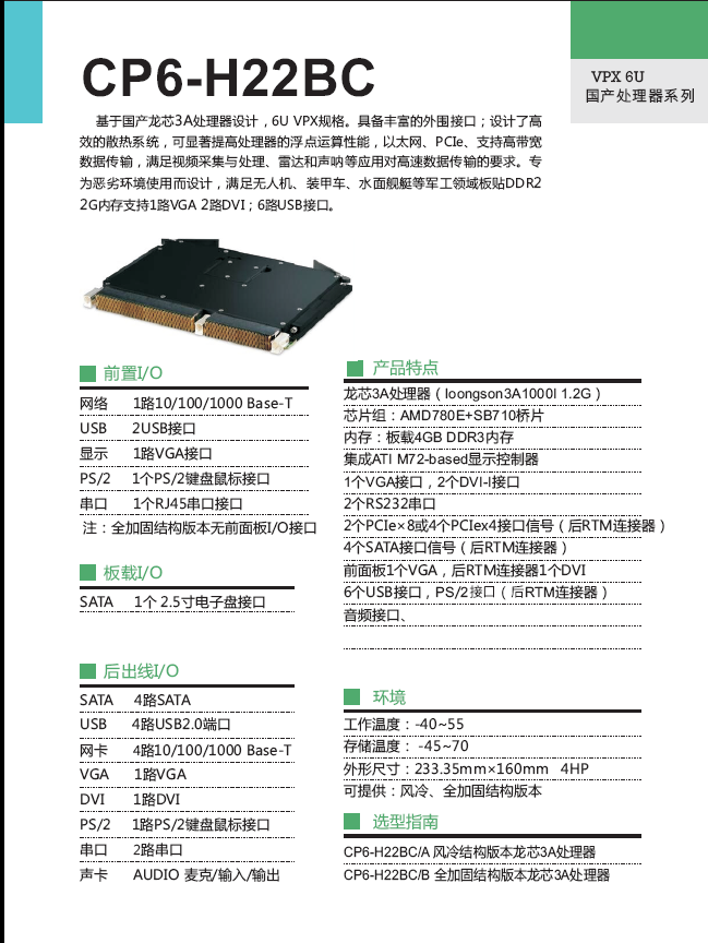 基于國產龍芯3A處理器設計,6U VPX規(guī)格。具備豐富的外圍接口;設計了高