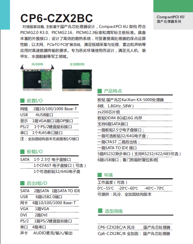 基于國(guó)產(chǎn)飛騰兆芯處理器設(shè)計(jì),CompactPCI 6U 架構(gòu),符合PICMG2.0