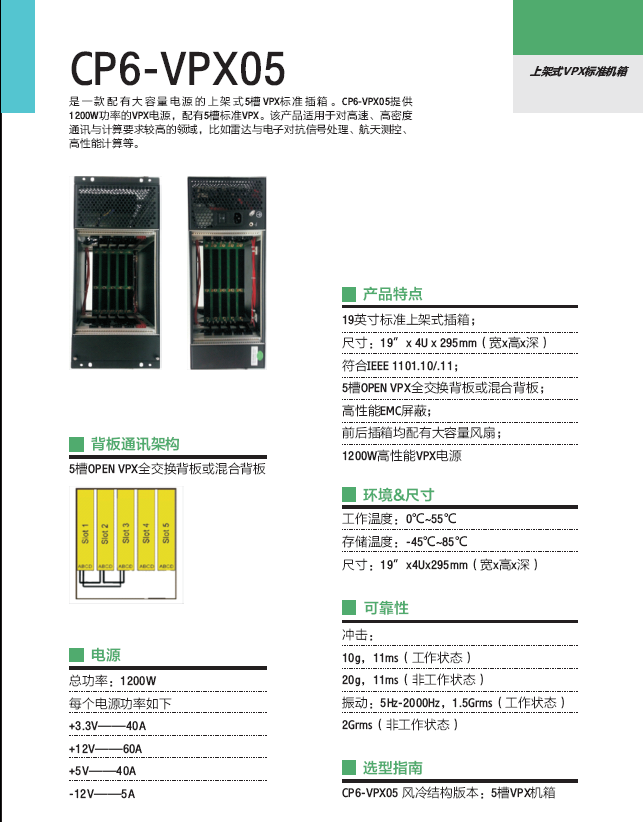 CP6-VPX05 是一款配有大容量電源的上架式5槽VPX標(biāo)準(zhǔn)插箱。CP6-VPX05提供 1200W功率的VPX電源,配有5槽標(biāo)準(zhǔn)VPX。該產(chǎn)品適用于對(duì)高速、高密度 通訊與計(jì)算要求較高的領(lǐng)域,比如雷達(dá)與電子對(duì)抗信號(hào)處理、航天測(cè)控、 高性...